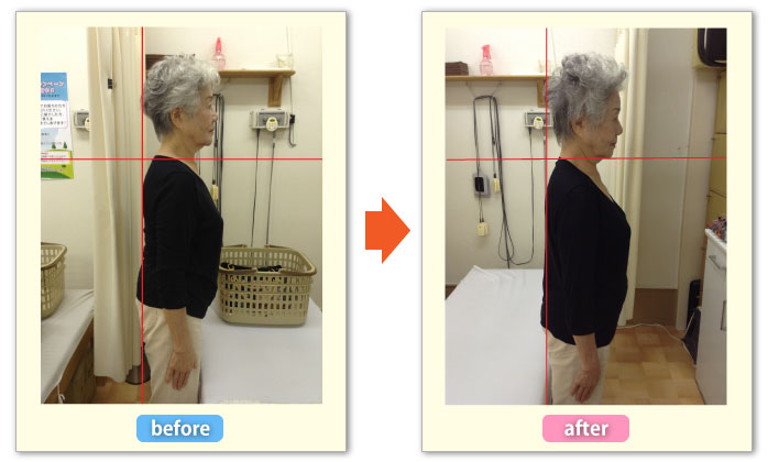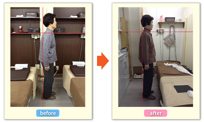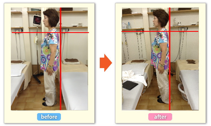 ストレートネックと巻型がとれ、頭・背中・かかとのライン一直線に結ばれ、理想的な姿勢になりました。